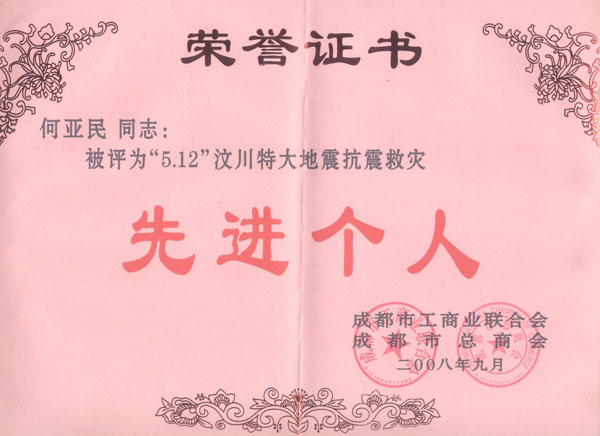 董事長何亞民被評為“5.12”汶川特大地震抗震救災(zāi)先進(jìn)個(gè)人