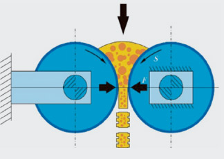 CLM系列高壓輥磨機(jī)是基于料床粉碎原理設(shè)計(jì)的一種粉磨設(shè)備,主要由機(jī)架、輥系、液壓系統(tǒng)、進(jìn)料裝置、控制系統(tǒng)、傳動(dòng)系統(tǒng)等組成。輥系分為活動(dòng)輥系和固定輥系,兩個(gè)輥系做慢速的相對(duì)轉(zhuǎn)動(dòng),活動(dòng)輥系通過(guò)液壓缸施壓可在機(jī)架導(dǎo)軌上作水平運(yùn)動(dòng),使連續(xù)喂入兩輥?zhàn)娱g隙的物料被粉碎,壓成料餅下落至機(jī)外。